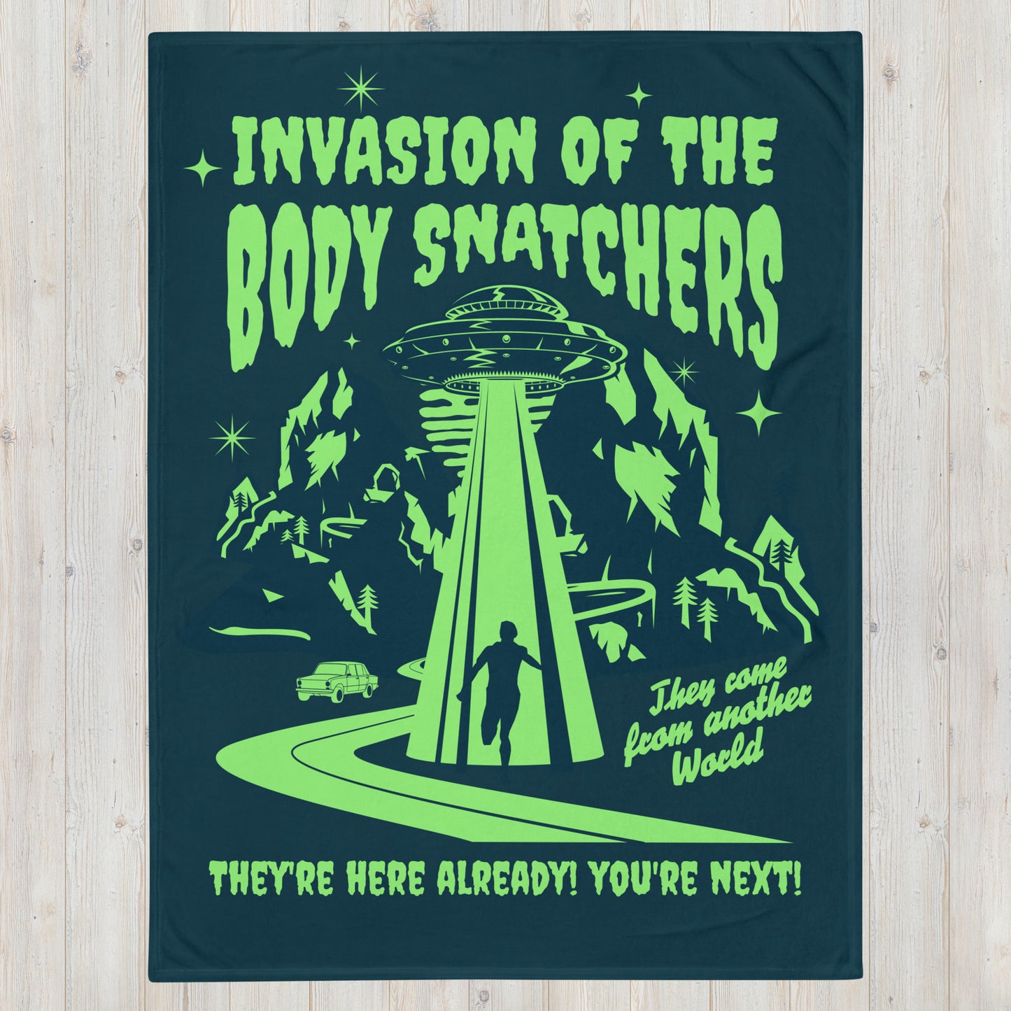 Be sure to catch a good night's rest with our Body Snatchers Throw Blanket! This soft and snuggly polyester blanket will protect you from those pesky aliens, as it's flame retardant and hypoallergenic! Watch out for those little green men—take the dull out of sleeping with this machine-washable alien-proofer! Slumber in peace!